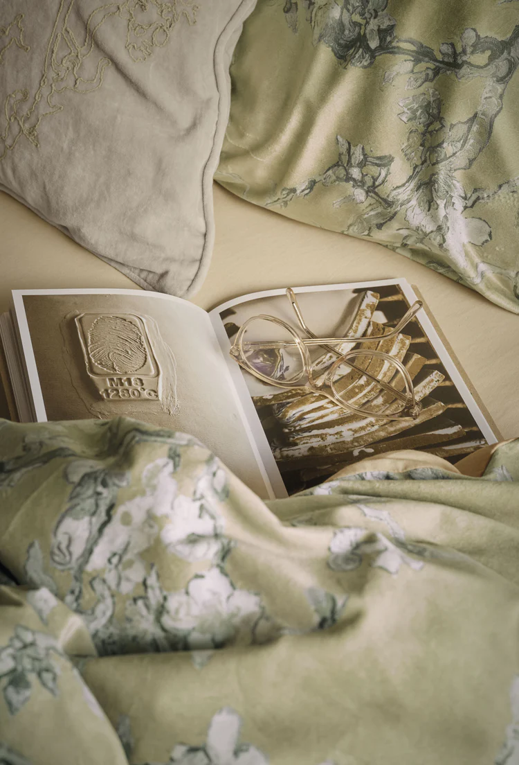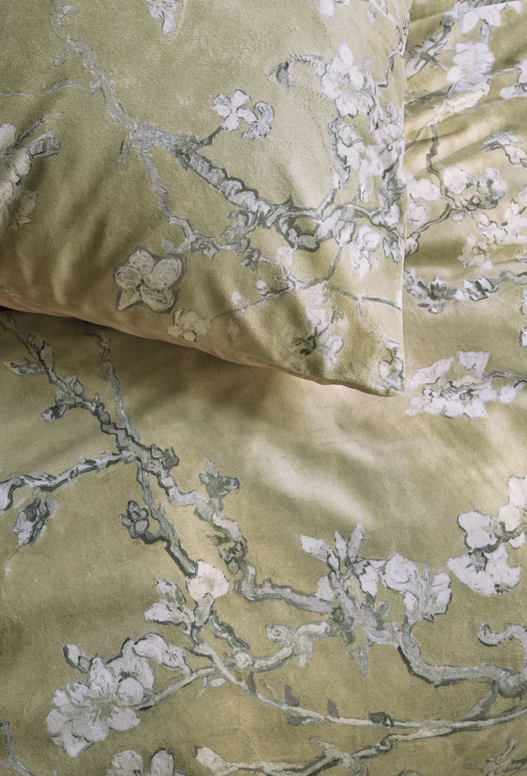 Breng kunst in je slaapkamer met Fleur de Velours van Beddinghouse x Van Gogh Museum. Een eigentijdse interpretatie van Van Goghs geliefde amandelbloesem, met sierlijke bloeiende takken op een chique ondergrond. Het dessin ademt rust, verfijning en een vleugje luxe. Een stijlvol eerbetoon aan nieuw leven – en aan Vincent zelf. Afgewerkt met een effen gekleurde achtetzijde.