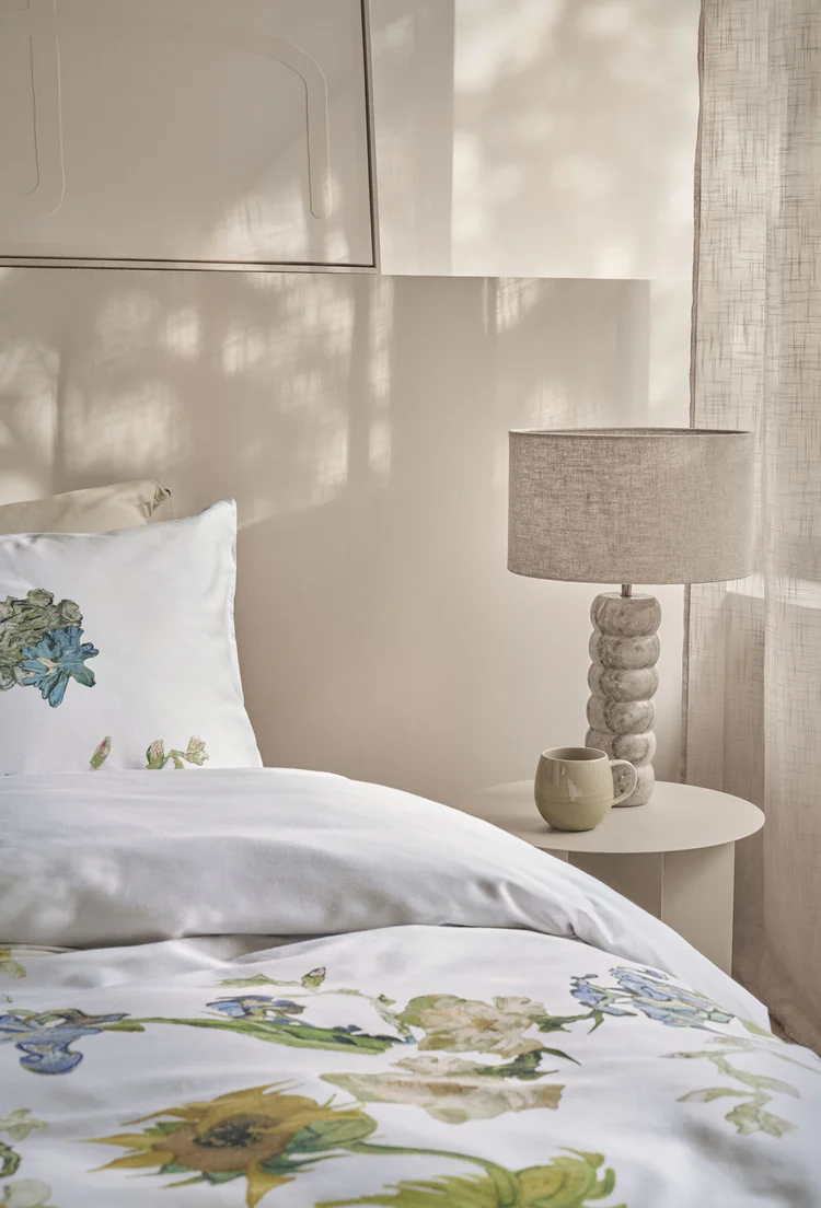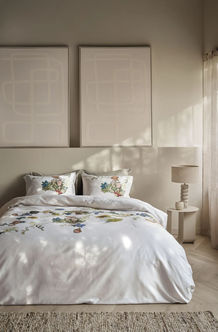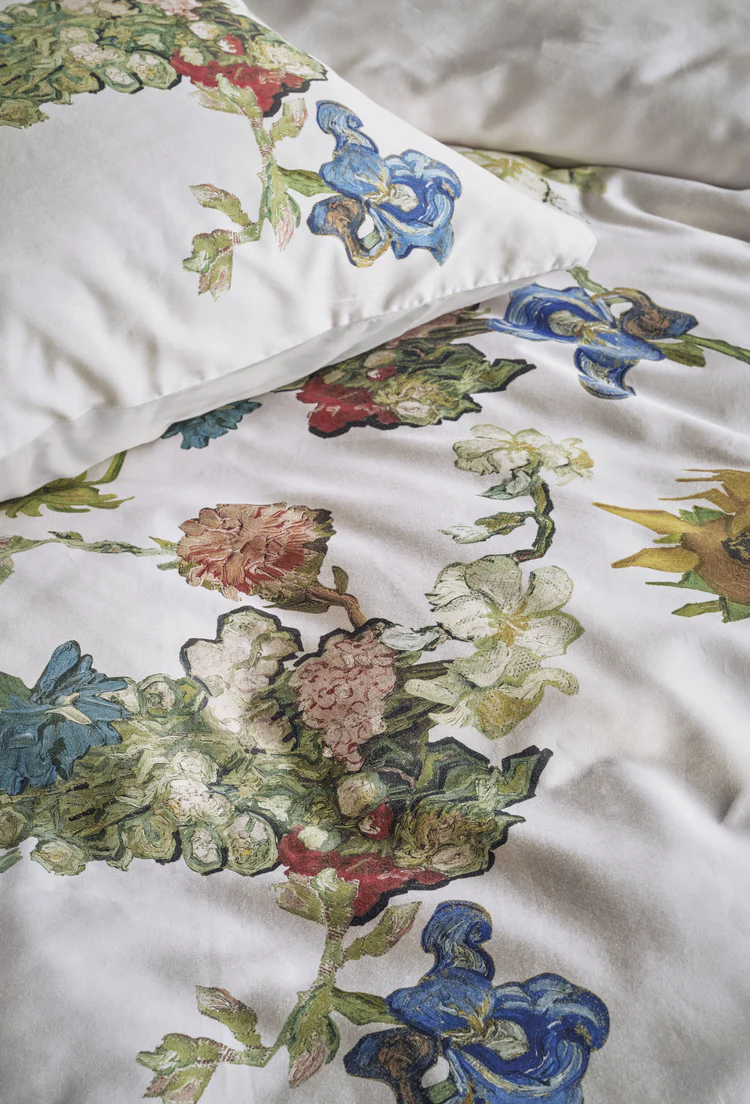 Dekbedovertrek Guirlande des Fleurs is een klassieke vertaling van het Bouquet d’Anniversaire, ter ere van het 50-jarig jubileum van het Van Gogh Museum. Het dessin, geïnspireerd door de mooiste bloemen uit de collectie van het museum, toont onder andere irissen, pioenrozen en zonnebloemen. De bloemen komen prachtig tot leven op de zachte achtergrond. De effen achterzijde zorgt voor een rustige afwisseling, perfect voor een harmonieuze slaapkamer.