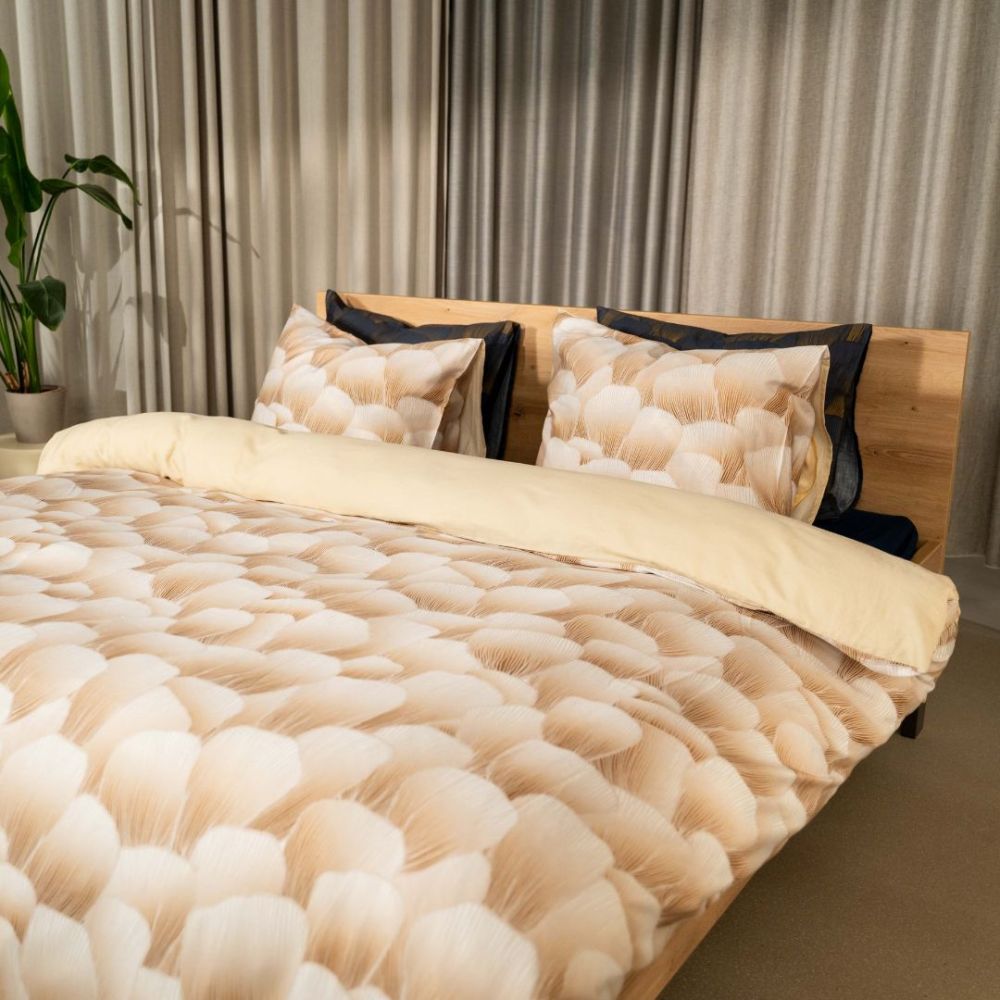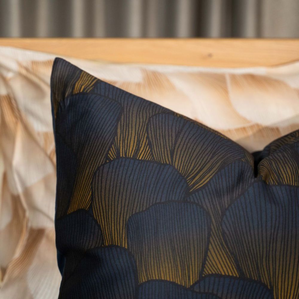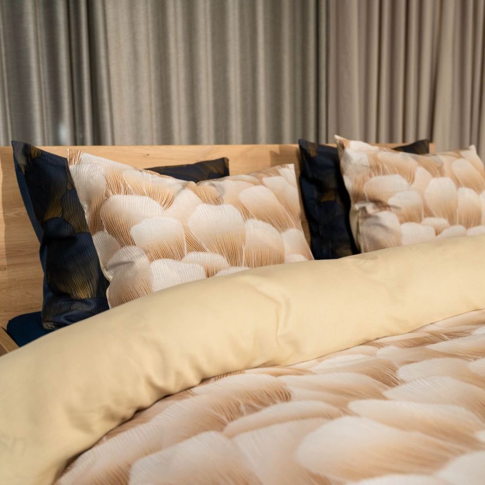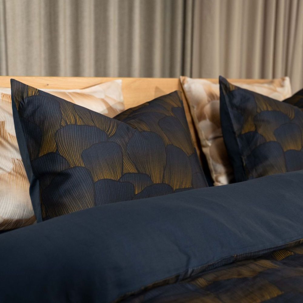 Koji dekbedovertrek heeft een bijzondere, rijke print waarbij goudkleurige lijnen over een diepblauwe ondergrond lopen. De subtiele schelpjes geven de print diepte en stijl. Dekbedovertrek Koji is gemaakt van 100% GOTS-gecertificeerd katoen-satijn, deze stof is superzacht en soepel. Daarnaast heeft katoen-satijn een prachtige subtiele glans.